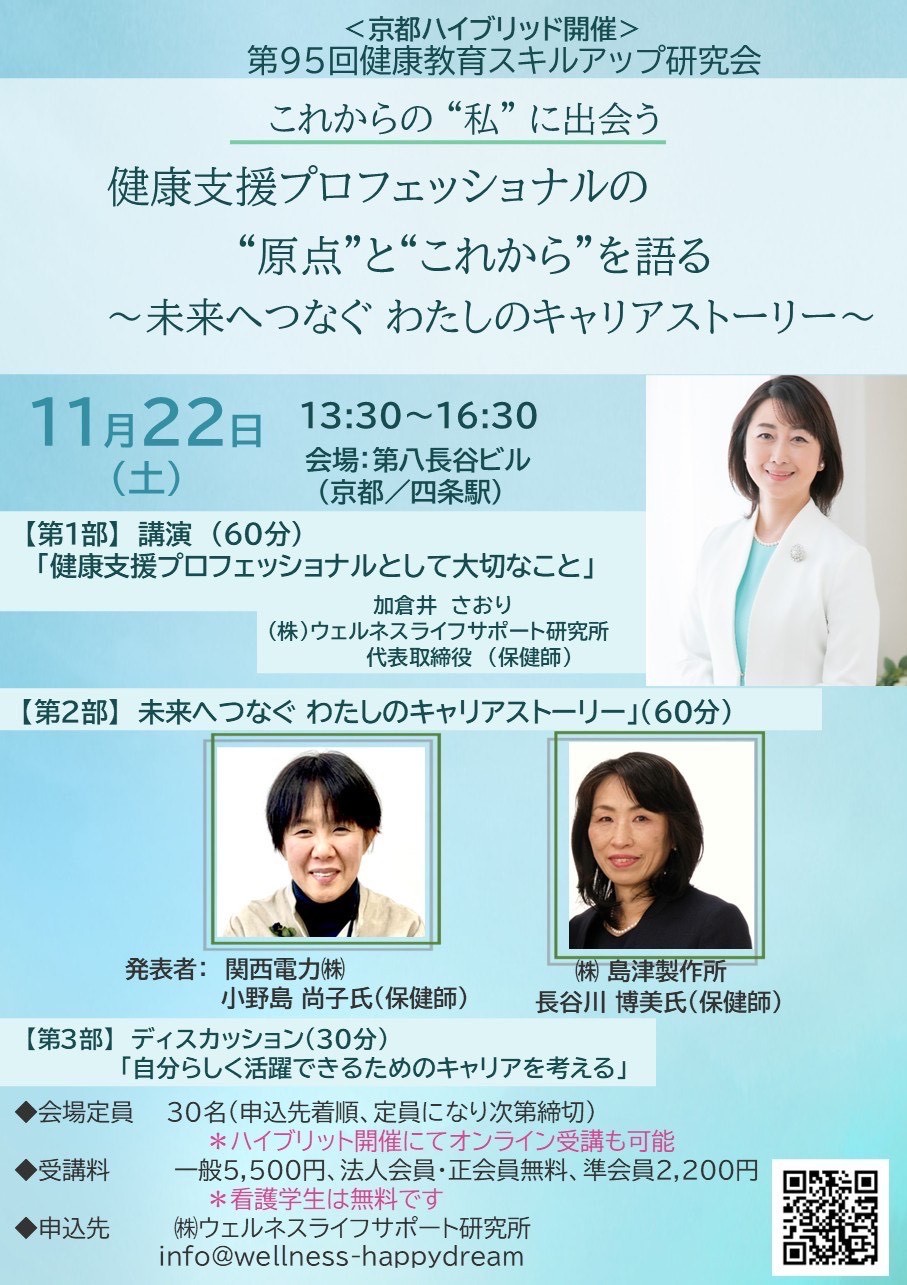 ◆【募集】<京都にてハイブリッド開催>11/22第95回 健康教育スキルアップ研究会 「健康支援プロフェッショナルの“原点”と “これから”を語る~未来へつなぐ わたしのキャリアストーリー」